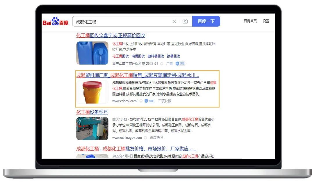 官網(wǎng)優(yōu)化:成都化工桶、成都豆瓣桶、成都橢圓塑料桶、成都防凍裂桶等關(guān)鍵詞,均在百度首頁(yè)展現(xiàn),準(zhǔn)確鎖定有需求的客戶。