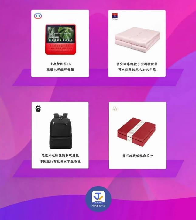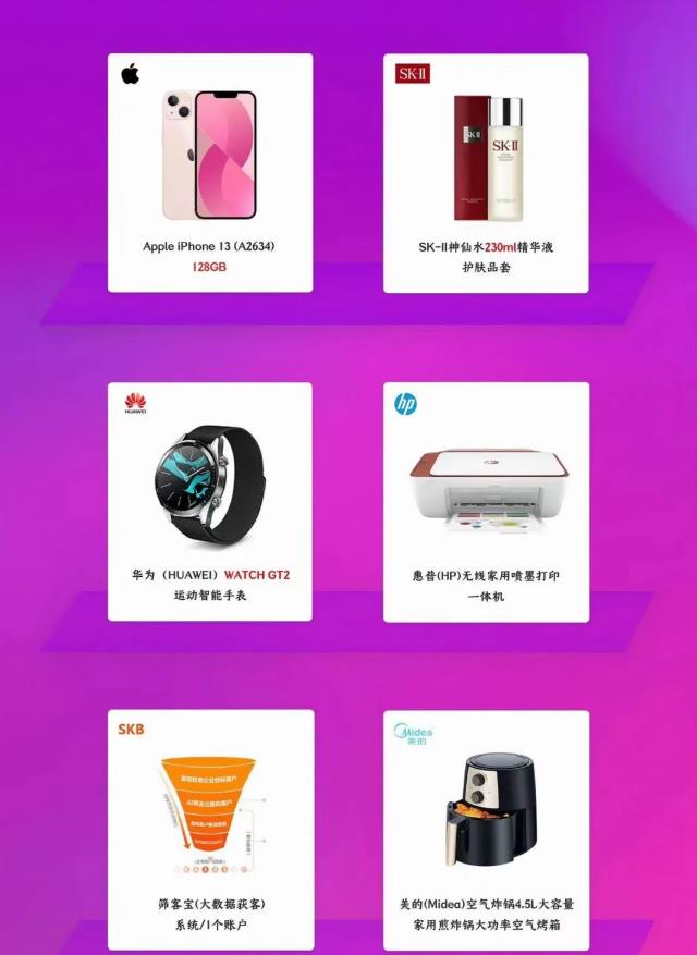 IPhone13、SK-II神仙水、華為手表、HP噴墨打印機(jī)、篩客寶系統(tǒng)、美的空氣炸鍋、小度智能屏、富安娜家紡被、筆記本電腦包商務(wù)雙肩包、普洱珍藏版禮盒茶......