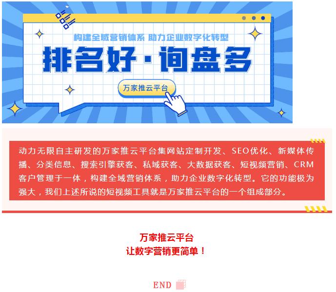 不止于此,我們還給客戶提供一項(xiàng)獨(dú)門絕技——萬(wàn)家推短視頻智能化工具。